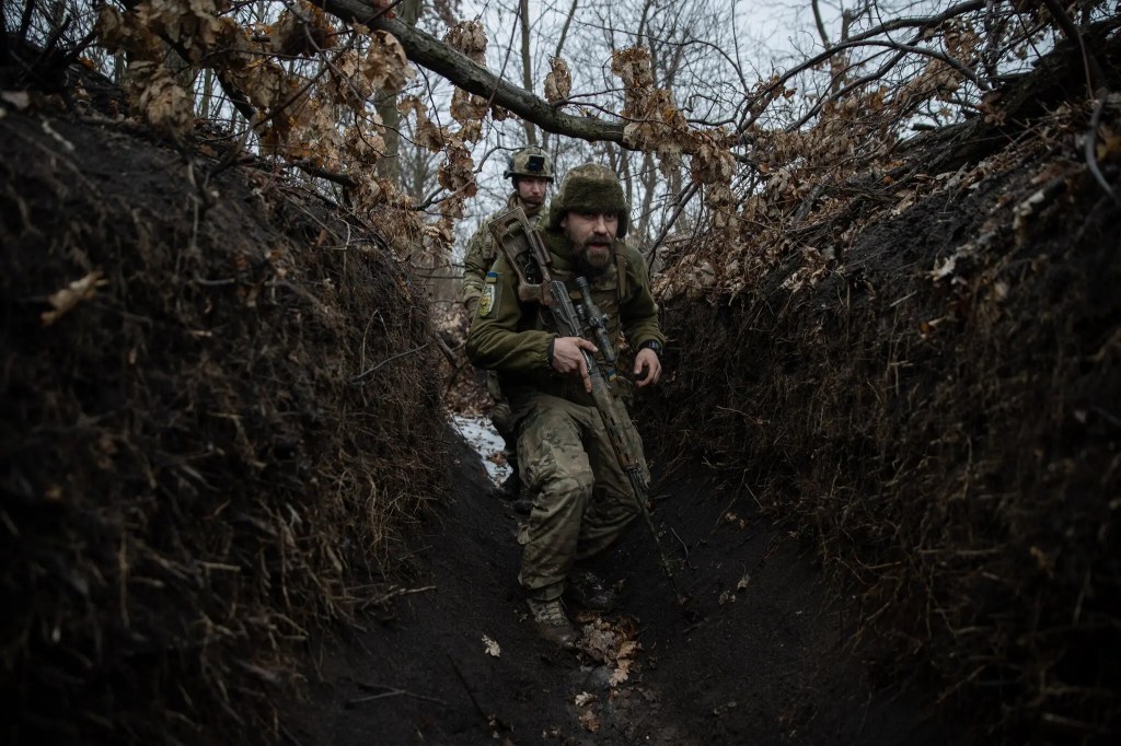 Trudging through mud and water in the trenches around Marinka
